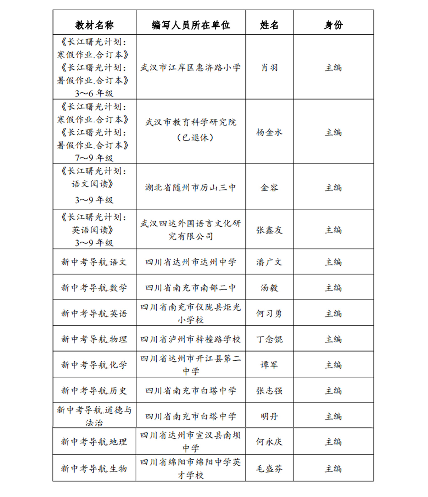 根据《国家新闻出版广电总局 教育部 国家发展改革委关于印发<中小学教辅材料管理办法>的通知》(新广出发[2015]45号),《四川省2025年中小学教辅材料评议公告》的有关要求,经教师所在单位党总支对编写人员资格审查,确定杨金水等老师具有相应学科专业教育教学经验,熟悉教育政策、相关教材及教学实际;政治立场坚定,拥护中国共产党的领导,认同中国特色社会主义,坚定“四个自信”,自觉践行社会主义核心价值观,具有正确的世界观、人生观、价值观,坚持正确的国家观、民族观、历史观、文化观、宗教观,没有违背党的理论和路线方针政策的言行,符合教辅材料编写人员条件。